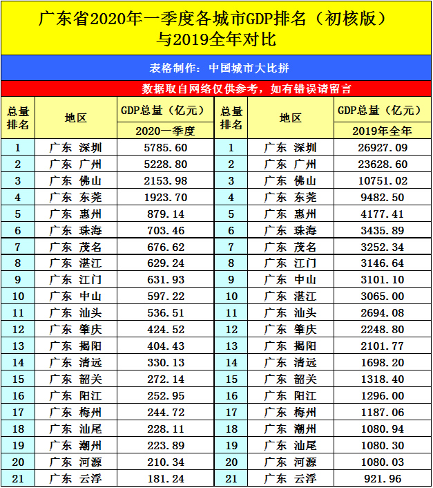 由此可见,目前珠海的GDP与茂名和惠州相比都差不多,不过我们珠海的人均GDP是很高的,甚至跟省会广州相比也是有过之而无不及,那么我们珠海人也不能因此骄傲自满,大家多帮助珠海宣传宣传家乡之美,可否吸引更多有钱人和大老板到我们珠海投资办厂,给我们珠海GDP总量再提升一个段位呢?你认为家乡还有哪些更容易增加GDP的特产和方法呢?2020年你更看好谁呢?我们评论区见,下图为2020年一季度各个城市GDP排名,数据收集于网络,部分城市数据并非官宣,如有错误请评论区留言,小编我及时修正和持续更新